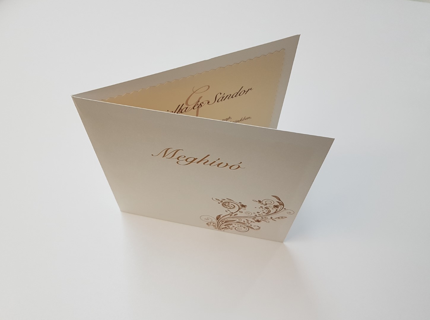 15 x 15 cm összehajtott állapotban. 250 gr-os Curious metál kartonból. Belsejében színes nyomtatással, ragasztott mintavágott szélű betétlapokkal.