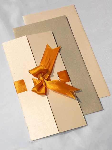 10 x 21 cm összehajtott állapotban. Kinyitva A/4-esnél valamivel rövidebb méretű 3 részre hajtva, középen függőleges vágással. 300 gr-os pezsgő színű Curious metal kartonból. Belsejében 10×21 cm-es fehér pausz papír narancssárga nyomtatással, felső és alsó részén virág sormintával. Narancs színű 25 mm-es szatén szalaggal átkötve.